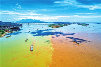 鄱阳湖与长江交汇处,水域分界线泾渭分明。(李学华 摄)