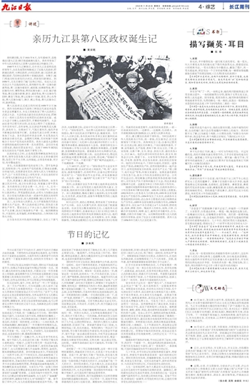 随着时间推移和革命形势的变化,区政府各项中心工作任务年年不断变化更新。1951年主要是土改复查;1952年的中心任务是大力兴修水利;1953年全面发展农业生产互助合作;1954年发生了大水灾,沿湖各乡主要是组织防洪抢险,近山各乡主要是试点成立初级农业生产合作社;1955年全面发展农业初级合作社;1956年撤区并乡,全区14个乡合并成立4个大乡政府,即将花盘、雨淋、牌楼、住岭。陶溪并入住岭乡,垅岗、石桥、白鹤合并为垅岗乡,杨柳、金兰、徽州合并为徽州乡,白马、麒麟、兴联合并为城门乡。从而顺利结束第八区人民政府的历史使命,迎来了社会主义建设新征程。我本人也于1956年5月调入九江县纪委工作。