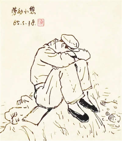 淳湖是紧邻修河的一个公社,永光则是距淳湖公社所在地东北27华里远的一个大队,大队下辖有造头村、饶村、张陈村等四个自然村,主要作物为棉花、油菜等。当时的“社教”队员每人都发了一份《队员守则》,我们都是按上面的要求,自带被褥、脸盆等日用品,选择贫下中农家庭吃饭或住宿,除工作时间外,也和群众同劳动,打成一片。我在一户戴姓的老乡家吃饭,除按规定给付钱和粮票外,还经常为他家翻过堤坝到修河挑水。我还保留一幅当年的写生画,队员黄祖竟和社员同挑塘泥时中途休息,抓紧时间睡一会。我年轻时随身带着速写本,把他打瞌睡的场面画下来了。他是坐在当地很有特色的一把锹上打瞌睡,和其他地方的锹不同,锹身金属部分较窄,但很长,约比其他地方的锹长一倍。这是适应当地地质特点而形成的劳动工具,因是河滨淤积平原,泥土疏松,用这种锹可省力而起土多。