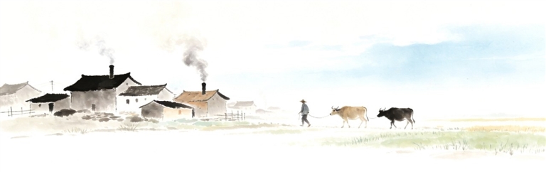 比四叔公的烟柱更安静的是河滩上田埂边兰博叔和他的牛。他的标志是那两条总也吃不饱似的黄牛,和他那永远卷不齐整的裤脚。解放鞋是标配,粘着泥巴,一只裤脚高高卷到小腿肚,另一只却只松松地挽在脚踝,就那么一高一低地挂着,形成一种和谐的不对称。他的头发,像遭了灾的庄稼,东倒西歪。他的牛却懂他,温驯地跟着他,将大把大把丰腴得近乎静止的时光,嚼得沙沙作响。夕阳西下时,他牵着牛,拖着长短不一的影子,慢吞吞地踱回村里。那身影,那节奏,就是一首歌咏黄昏的古老谣曲。