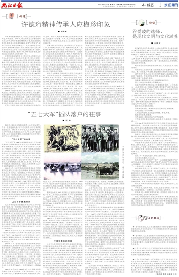 1968年10月13日,九江地、市革委会在人民剧院广场召开九江地区“五七大军”命名授旗大会,会后还举行了游行。10月15日在九江市甘棠公园、九江二中操场红旗飘扬,锣鼓喧天,群众载歌载舞,欢送九江市首批大规模的知青上山下乡,10月28日欢送第二批知青上山下乡。